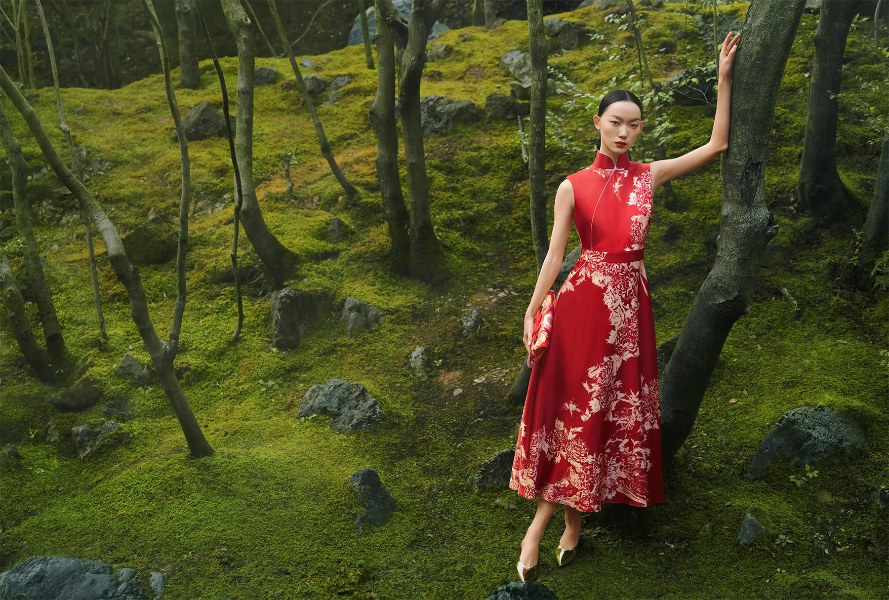 Rendered in luminous red — the colour of celebration, fortune and new beginnings — the collection draws inspiration from the ritual of wearing new garments for the Lunar New Year, a custom that dates back to the Song dynasty. Silk fabrics with layered sheen enhance the movement of the dragon form, creating shifting tones of light that evoke both heritage and modern elegance.