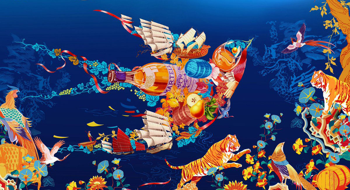 The work creates a visual dialogue between French cognac heritage and contemporary Chinese iconography, transforming traditional brand symbols into a narrative of cultural exchange, movement and celebration.